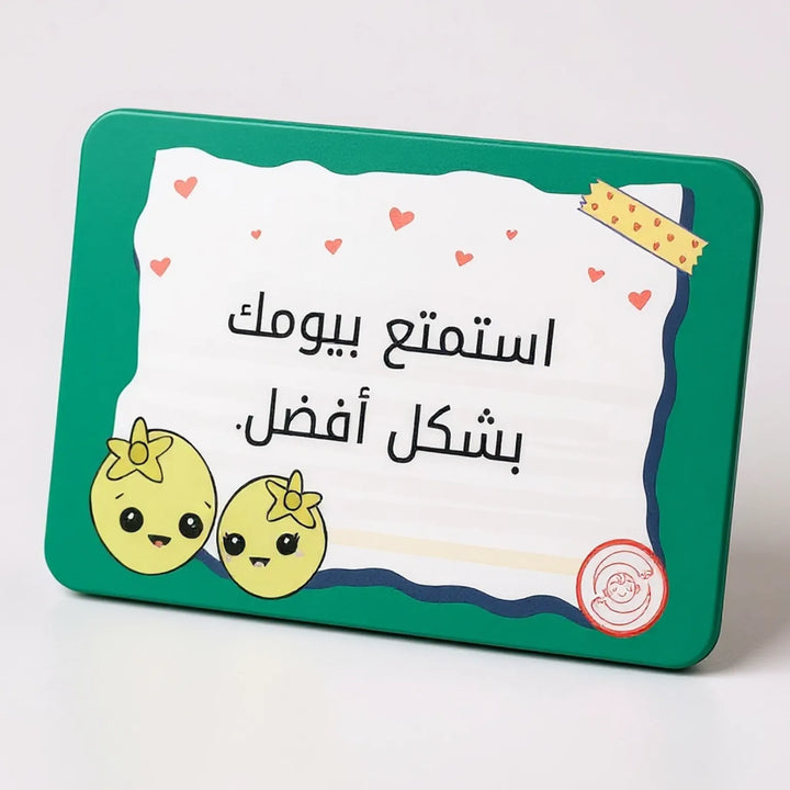 كل بطاقة تحمل رسالة بسيطة وملهمة، يمكن وضعها داخل علبة الطعام لتمنح طفلك لحظة سعادة وسط يومه الدراسي، وتخلق رابطة وجدانية بينكما حتى وأنت بعيد عنه.