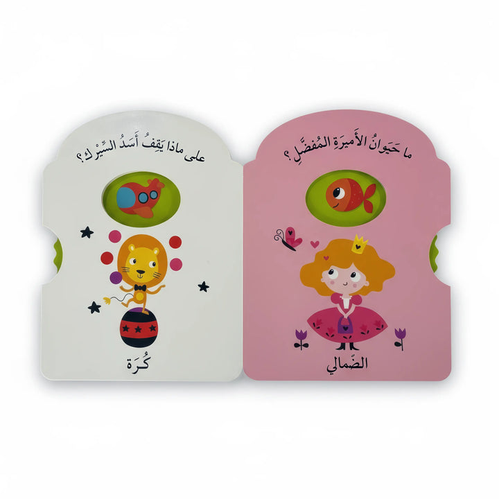 كتاب تفاعلي ممتع يساعد الأطفال على توسيع حصيلتهم اللغوية بطريقة مسلية ومبتكرة. يقرأ الطفل السؤال، ثم ينظر إلى الصورة ليكتشف الإجابة من خلال تدوير العجلة، فيتعلم كلمات جديدة ويتفاعل مع المحتوى بأسلوب مشوّق يعزز الفهم والانتباه.